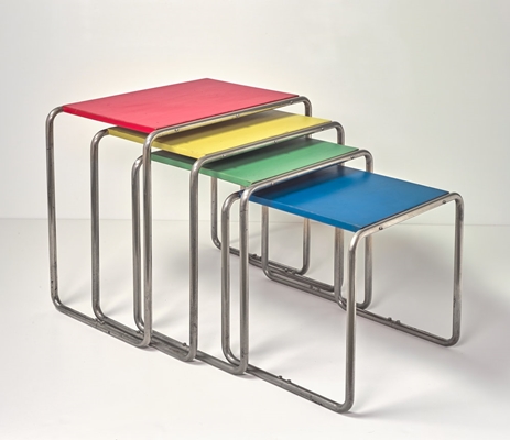 Marcel Breuer, vier bijzettafels, ca. 1926, vernikkeld metaal, in vier kleuren gelakt hout