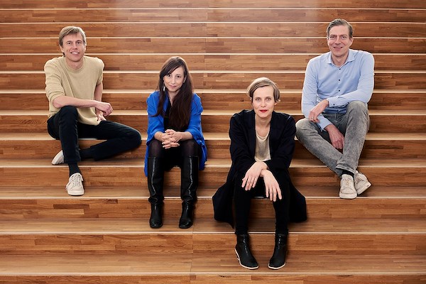 Team van curatoren (vlnr): Peter Veenstra, Léa-Catherine Szacka, Véronique Patteeuw, Derk Loorbach
