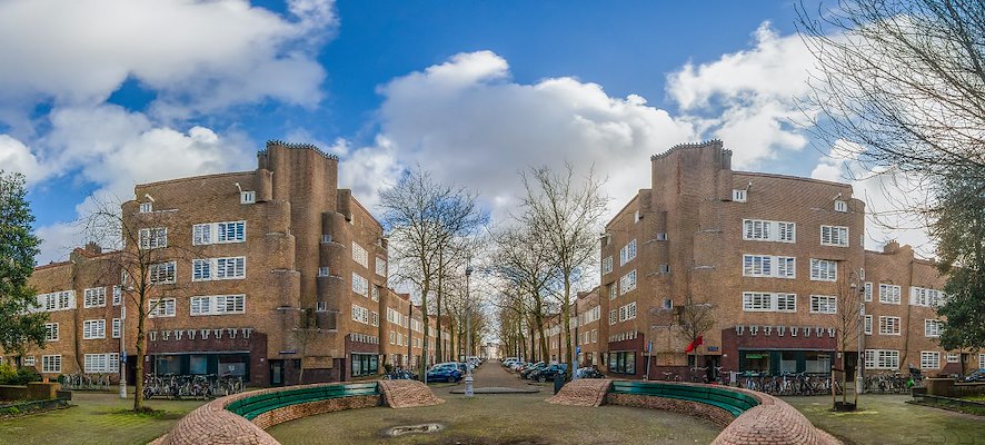 Panoramashot van volkswoningbouwcomplex De Dageraad in Amsterdam Zuid, Michel de Klerk en Piet Kramer, 1918-1923
