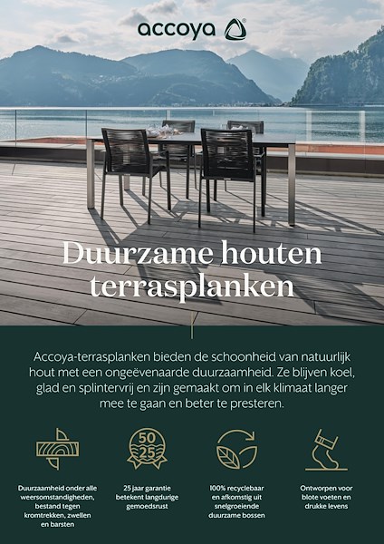 Accoya gemodificeerd hout heeft zich ontwikkeld tot de standaard in de houtindustrie als het gaat om prestaties en duurzaamheid. Geen enkel ander verduurzaamd hout biedt dezelfde combinatie van lange levensduur en dimensionale stabiliteit. Duurzaam geproduceerd en met een lage CO2-voetafdruk draagt Accoya actief bij aan een circulaire, biobased economie.