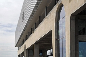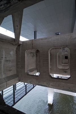 . Het gebouw zweeft drie meter boven de dikke betonnen wanden van de onderbouw. Respect voor het fundament en ‘architectuur maken door zo min mogelijk architectuur te maken’ behoorden tot de uitgangspunten van het ontwerp. Het gebouw van glas is helder en eenvoudig van opzet. De nieuwbouw kenmerkt zich door een grote mate van transparantie en is voorzien van een dubbele glazen klimaatgevel als glazen kantwerk. De binnengevel met draaiende delen van hout, de buitengevel met motorische aangedreven glazen lamellen. Bij herontwikkeling is gebruik gemaakt van al bestaande voorzieningen. Zo bieden de vier voormalige oude trappenhuizen wederom toegang tot het pand, maar ze zijn voorzien van een panoramalift met nieuwe trappen. De twee loopbruggen die zich over de hele lengte aan de waterzijde bevinden, fungeren als vluchtroute. In het hart van de oude betonconstructie, vlak onder de kantoorvloer, bevinden zich de archiefruimten.