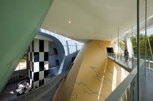 . In contrast met het kleurrijke interieur staat de witte huid van het bootachtige gebouw. Ook in de omgeving is het een opvallende verschijning: het museum staat namelijk midden in een bos.