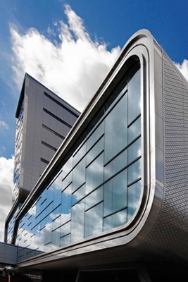 in Amsterdam. Deze jongste uitbreiding van de RAI kenmerkt zich door zijn karakteristieke vorm en innovatieve gevel. Het gebouw is ontworpen door