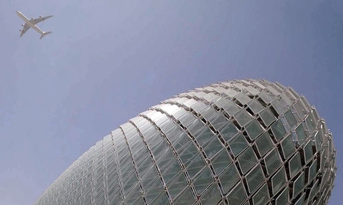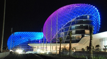 Een hotel midden op een Formule 1-circuit is wereldwijd uniek. De vorm van het Yas Hotel doet denken aan een wapperende finishvlag, ook qua dynamiek. De 5800 diamantvormige glaspanelen in de 217 meter lange dakconstructie kunnen namelijk scharnieren.