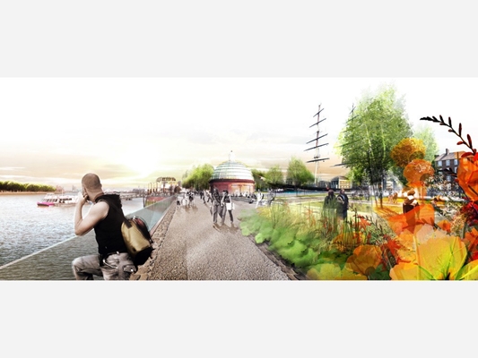 ,,Een tektonisch landschap zorgt voor gemakkelijke toegang op de verschillende niveaus. Cutty Sark Gardens krijgen een betere relatie met de Thames en de omringende straten. Nieuwe levendige façades vormen een essentieel onderdeel voor de verbetering van de plek.”