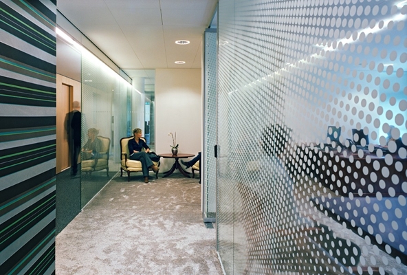 Op de eerste verdiepingen zijn aparte kantorenruimtes en een informele open vloer die door middel van een doorlopend houten gangmeubel met elkaar in samenhang gebracht worden. Verder zijn er veel glazen wanden.