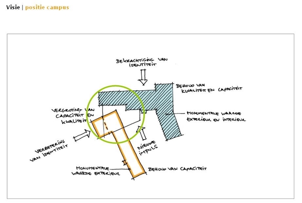 De gebouwen zullen worden verbonden via een zogeheten campus, die meerdere verdiepingen telt en doorkijkmogelijkheden biedt. Op die manier moet de gewenste dynamiek ontstaan en het ‘raakvlak tussen alle organisaties’ worden geoptimaliseerd.
