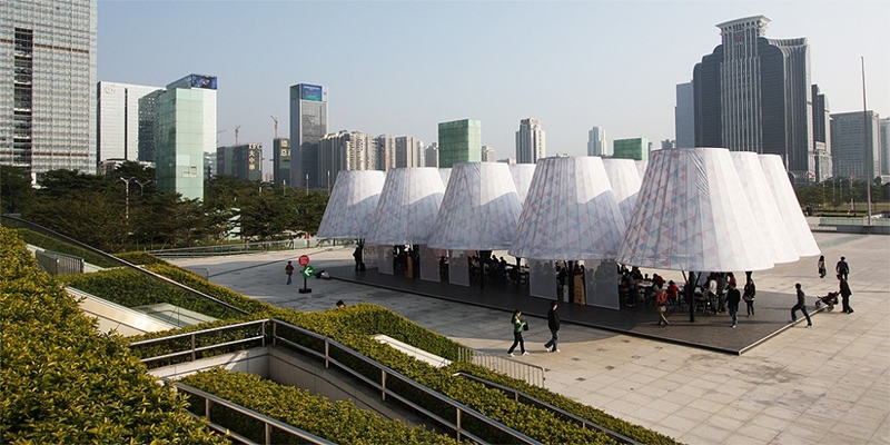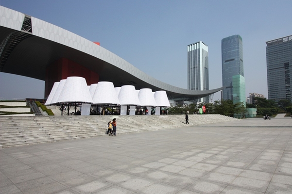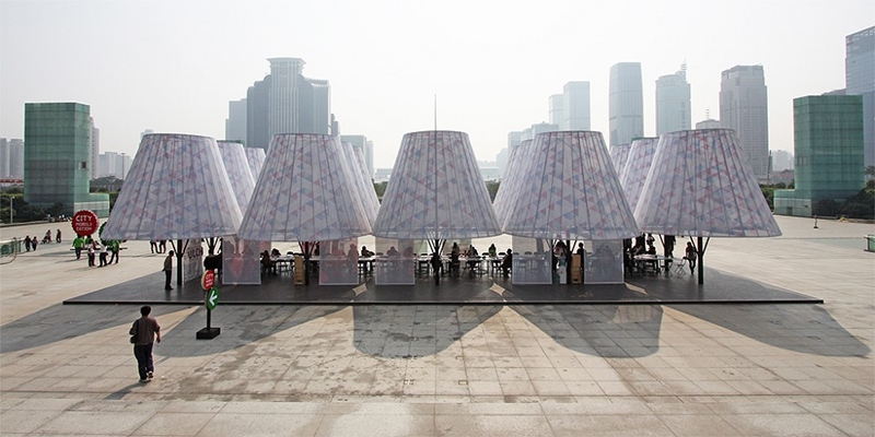 Zijn het nu bomen of lampenkappen? Met die vraag bevolkten vele inwoners afgelopen week het normaal niet voor publiek gebruik bestemde Civic Square in Shenzhen. Daar is namelijk het Medular Pavilion van het Nederlandse