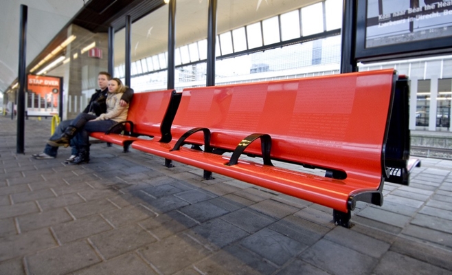 hebben beschikken sinds vorige maand over een eigen bankje op de perrons van Amsterdam Centraal, Schiphol en Rotterdam Centraal. De ontwerpers van