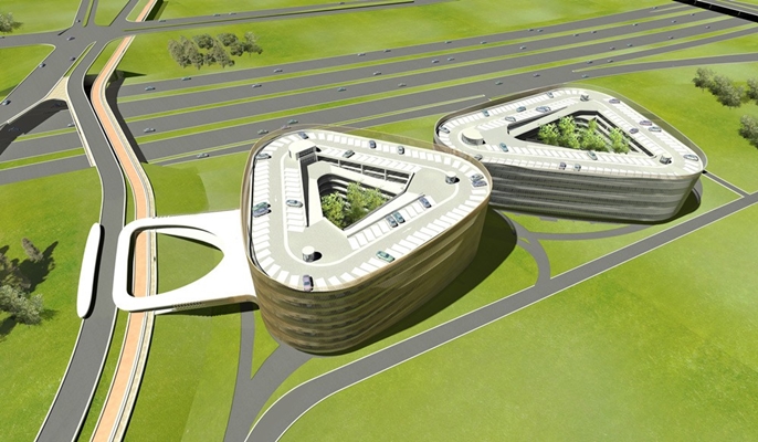 Het ensemble vormt een landmark aan de snelweg, zeggen de bureaus. Opgetild boven maaiveld, steken de 9 en 7 verdiepingen hoge gebouwen uit boven het nieuwe viaduct en de geluidswal. De driehoekige vorm relateert aan de belangrijkste zichtlijnen en verankert de gebouwen in hun omgeving.