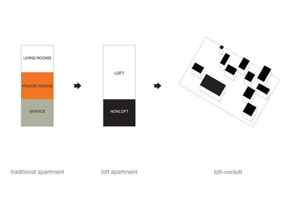 De Kort en Van Schaik ontwierpen lofts (royale appartementen bestaande uit één continue ruimte) van 350m2 met een uitgebreid programma. Om het complete woonprogramma van woonkamer, privéruimtes en dienstruimtes te kunnen realiseren, deelden De Kort en Van Schaik de lofts op in ruimte en massa. De zogenaamde non-loft elementen zoals badkamer, trappen en liften, worden als volumes in de ruimte geplaatst. Hierdoor ontstaat in die continue ruimte een afwisseling tussen privéruimtes en grote open ruimtes.