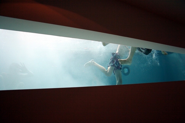 Op de eerste etage bevinden zich verder de ouderslaapkamer en een badkamer. De verdiepingen zijn met elkaar verbonden via een lift en een trappenhuis. Verbinding is er ook met de entree en het zwembad: wie binnenkomt heeft zicht onderwater via een glazen opening in de wand.