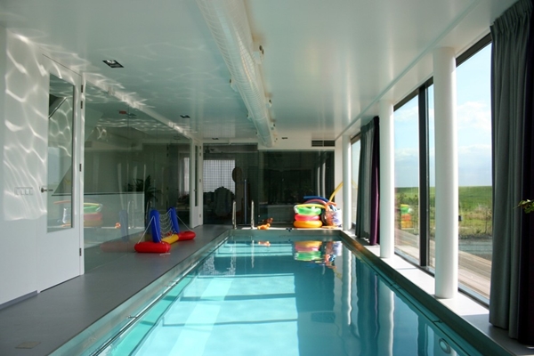 De ondergelegen verdieping is helemaal gereserveerd voor de kinderen. Zij hebben de beschikking over drie slaapkamers, een speelkamer en een eigen badkamer. Nog weelderiger is de binnenzwembad op de eerste verdiepingen, die met een te openen wand met een buitenterras is verbonden. Het zwembad kan zo het hele jaar worden benut.