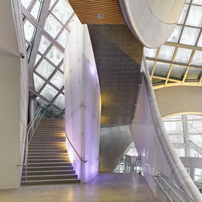 De golvende entree is tevens het centrale punt van het gebouw. Het 26 meter hoge atrium is van binnen al even vloeiend als aan de buitenkant en vormt zo een kunstwerk op zich. De rest van het interieur is wit en sober, zodat alle aandacht naar de collectie uitgaat.