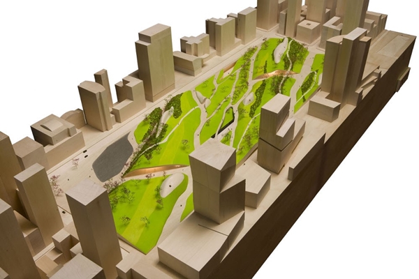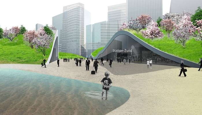 De winnaar ontwierp een glooiend park met daaronder het station als kloppend hart van de Amsterdamse Zuidas. Het project heet