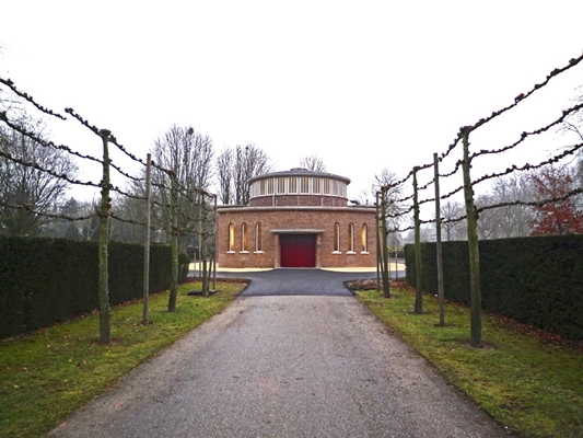 Het gebouw is in 1938 gebouwd als onderdeel van de uitbreiding van de begraafplaats. De aula bevindt zich in het cilindervormige deel, de koffieruimte en toiletgroepen bevinden zich in de gebogen aanbouw. De hoofdingang richt zich op de as van de uitbreiding van de begraafplaats.