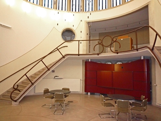 , met wie hij regelmatig samenwerkte. Voorbeeld hiervan zijn de ranke ronde trappen die naar het podium leiden. In 1957 werd het gebouw uitgebreid met een waaiervormige aanbouw.