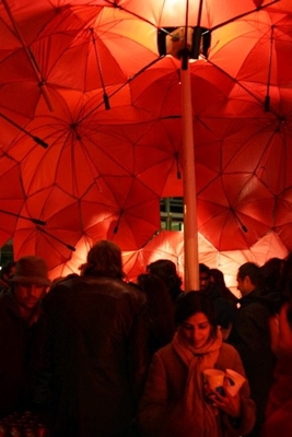 in Rotterdam leidde volgens de bedenkers tot een spontaan straatfeest. De volledig uitgeruste koepelbar, compleet met DJ en drank, trok zo’n driehonderd bezoekers. Het ‘spontane publieke gebouw’ van paraplu’s was in twee uur tijd opgebouwd.