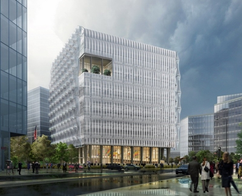 om een ontwerp te maken voor het gebouw, namelijk Morphosis, Pei Cobb Freed en Richard Meier & Partners. Volgens de VS ontwierp KieranTimberlake in een āwaarlijk iconische ambassadeā die een voortrekkersrol vervult op het gebied van duurzaam ontwerp.
