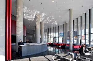 De hoogste en meest expressieve toren herbergt een hotel met 344 kamers. Het 110 meter hoge bouwwerk is bekleed met rode metalen panelen die alle licht zijn gebogen. Zo ontstaat een toren met een ‘ingedeukt’ uiterlijk, dat steeds verandert voor wie er aan voorbij rijdt.