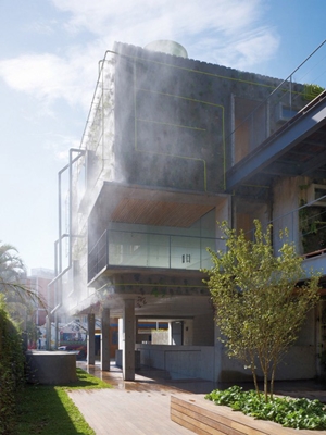 . Het bouwwerk bestaat uit begroeid beton en wordt geĆÆrrigeerd via een geĆÆntegreerd sproeisysteem. Dit heeft niet alleen praktisch nut, maar zorgt ook voor een fraaie mist rond het gebouw.