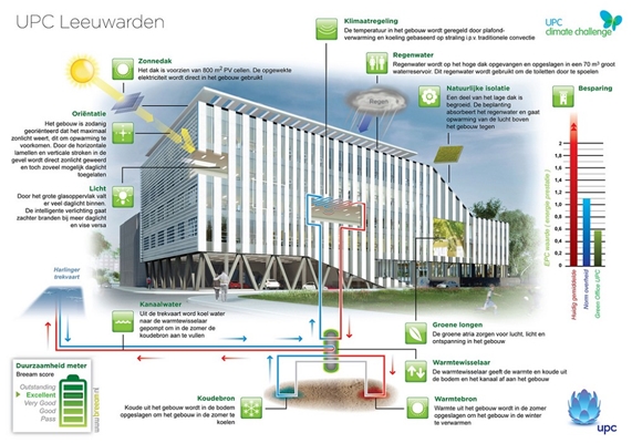 Het begroeide en van zonnepanlen voorziene dak zorgt voor isolatie en opslag van regenwater, dat wordt gebruik voor het doorspoelen van de toiletten. De warmte-koudeopslag wordt weer gevoed met water uit de nabijgelegen trekvaart.