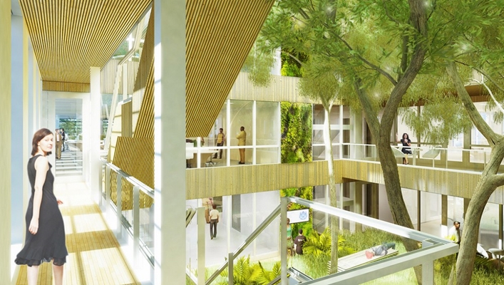 UPC zegt de medewerker centraal te stellen in het gebouw, waarin 450 personeelsleden worden ondergebracht. Ze krijgen open werkplekken, afgewisseld met ontspanningsplekken die uitzicht bieden op een van de met groen aangeklede atria.