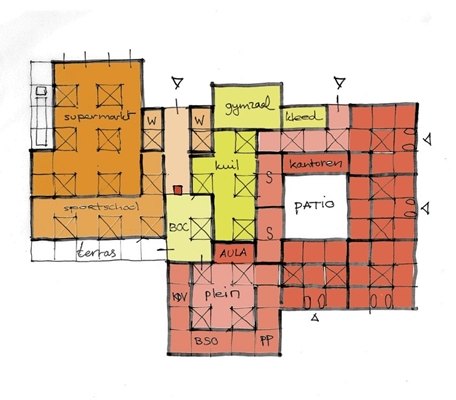Daarnaast wordt een nieuwe buitengevel aangebracht, die verwijst naar het oorspronkelijke idee van losse ruimtes onder een groot dak. De brede school en de commerciële functies worden gekoppeld door de buurtontmoetingsruimte, die het hart van het complex gaat vormen.