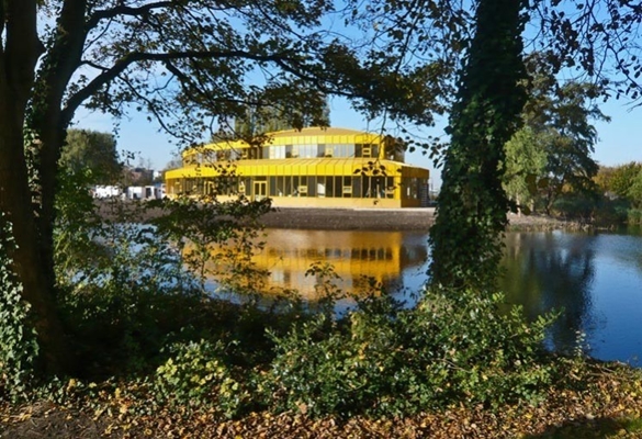 n het door groen en water omringde gebouw hebben de leerlingen alle mogelijkheden om vakken te leren, die ze buiten de school in praktijk brengen. De brug met de maatschappij wordt letterlijk gevormd door een brug die het terrein met de buitenwereld verbindt.