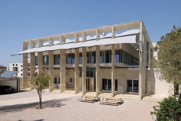 (een soort kalksteen). Deze omlijsting beschermt het gebouw tegen de zonnehitte en moet er voor zorgen dat de ambassademedewerkers voldoende daglicht ontvangen en van het uitzicht kunnen genieten.