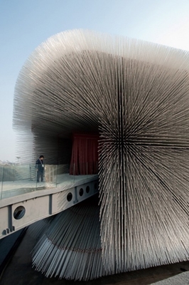 is het Britse paviljoen. Het bouwwerk valt op door zijn 60.000 uitsteeksels, die vanwege hun buigzaamheid voor extra dynamiek zorgen als het waait. ’s Avonds licht de zogeheten Seed Cathedral op.