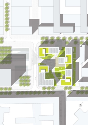 “Daardoor ontstaat een blok dat dichtheid biedt maar op hetzelfde moment open is; er ontstaan buitenruimtes van hoge kwaliteit met een introvert karakter die worden aangesloten op de structuur van de omliggende openbare ruimtes.”