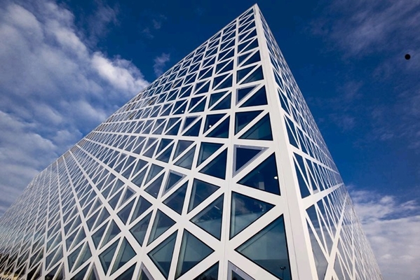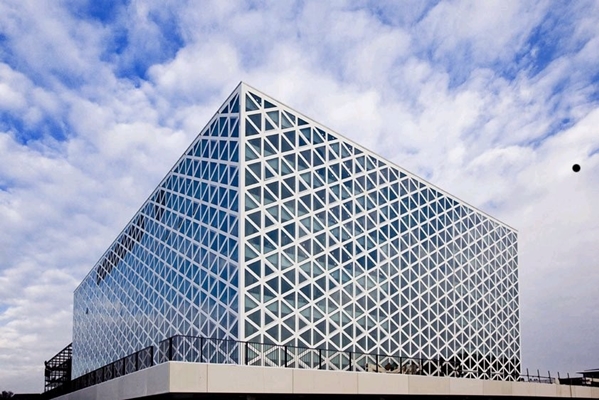 De gevel bestaat uit een omhulsel van witte kunststof gevelelementen van twaalf meter lang. Hierin zijn drieduizend driehoekige ruiten verwerkt, waardoor een X-vormig patroon ontstaat. Vandaar de naam Gebouw X.