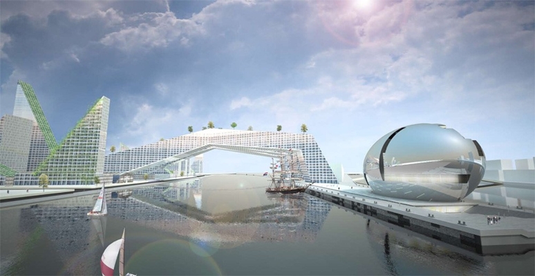 Het dorp is onderdeel van de nieuwe stad aan de noordoevers, een tegelijkertijd stedelijk- en groen gebied. Publieke voorzieningen, inclusief trainingsfaciliteiten en parkeren op de eerste lagen creëren een verhoogd park aan het water.