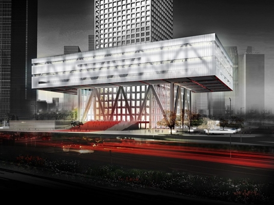 ontworpen gebouw huisvest de Chinese evenknie van de Nasdaq. Bijzonder is het enorme uitkragende volume met daarin de beursvloer.