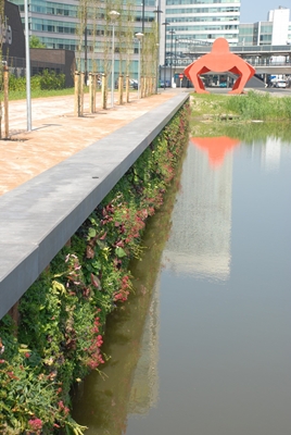 De groene kade is een onderdeel van de aankleding van het nieuwe, duurzame kantorenpark Beukenhorst-Zuid in Hoofddorp. Het gebied, dat wordt ingeklemd door de Zuidtangent en de A4, wordt ontwikkeld volgens een masterplan van