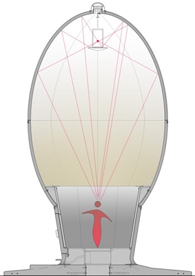Op de geluidinstallatie is een lichtinstallatie aangesloten. Dat zorgt ervoor dat het licht synchroon aan het geluid van kleur en intensiteit verandert. Door de vorm en afwerking van de binnenruimte wordt een oneindige ruimte gesuggereerd en kan geen diepte meer ervaren worden.