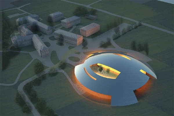 bij het Meer van Genève in Zwitserland. De Fransman won de bijbehorende besloten prijsvraag met een futuristische schotel.