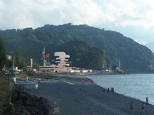 ontwierp een lang gebouw met een opvallende toren aan het voeteneind. Deze dient als wachtpost en landmark om bezoekers aan Georgië te verwelkomen.