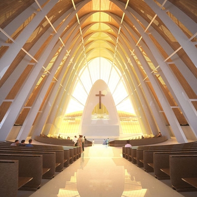 De grote zaal en de kapel zijn dankzij de grotendeels glazen gevels ruim voorzien van daglicht. De tweeduizend mensen die de gebedsdiensten kunnen bijwonen, hebben daarnaast een onbelemmerd uitzicht op het altaar. De kolommen, die deel uitmaken van de overspanning, staan buigend langs de zijkanten van de ruimte.