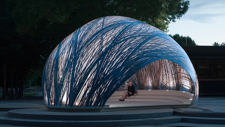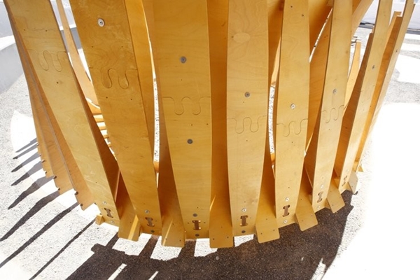 De constructie is opgebouwd uit elastische multiplexstrips met behulp van computerberekeningen. In totaal bestaat het paviljoen uit vijfhonderd verschillende onderdelen. Met het ontwerp wordt geprobeerd de nieuwste ontwikkelingen in computergestuurde ontwerp-, simulatie- en bouwprocessen in de architectuur te tonen.