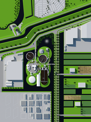 In het ontwerp van Syb van Breda & Co wordt de waterzuiveringsinstallatie opgenomen in het landschap, doordat bloemen, bomen, riet en een brede waterpartij de waterzuivering omringen. De belendende molen kan in het landschap blijven staan.
