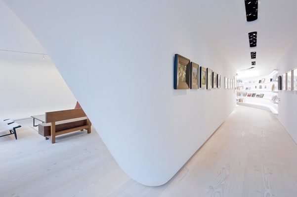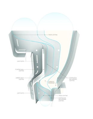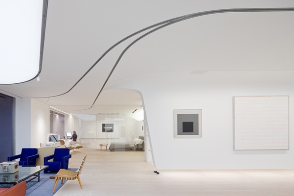 Centraal element in het nieuwe ontwerp is een soort zwevende S-vormige muur die de ruimte in lengte doorsnijdt. De verschillende ruimtes lopen vloeiend in elkaar over, een proces dat extra benadrukt wordt door de golvende wanden en op het plafond aangebrachte lijnen. Van Berkel: “Het verlangen naar een open ruimte was doorslaggevend. Hoewel er veel kunstwerken en boeken zijn, blijft het appartement heel licht en open.”