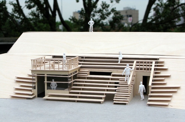 , waaraan ruim zeventig jonge architectenfirma’s deelnamen. Het 45 vierkante meter grote gebouw dient als plek waar de beheerder van de speeltuin toezicht kan houden.