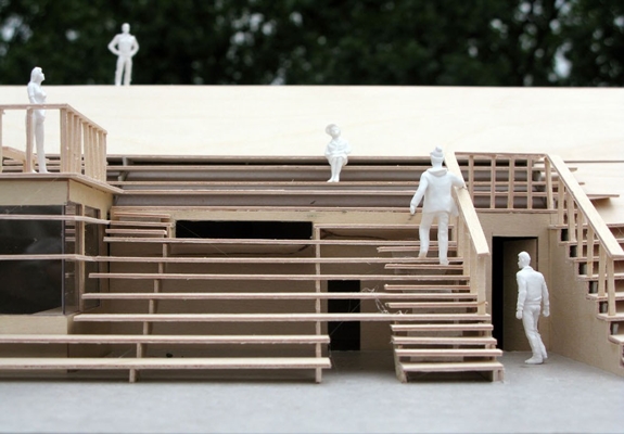 “Door de vormgeving en maatvoering van de traptreden ontstaat tegelijkertijd een tribune, waar men kan zitten, kijken, spelen en kletsen; een ontmoetingsplek voor ouders en kinderen uit de wijk. Onder de trap cq. tribune zitten de binnenruimtes voor de beheerders, afsluitbare toiletten en een overdekte schuil- en speelplaats.”