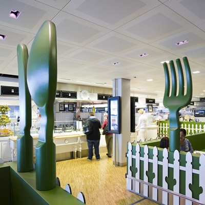 In het ontwerp voor het restaurant en de bar hebben de ontwerpers met schaal en verhouding van bekende objecten gespeeld. Zo kunnen bezoekers even uitrusten in een theekopje van een Delftsblauw servies of aan de ‘Mad Tea Party’-tafel typisch Nederlandse specialiteiten proeven.