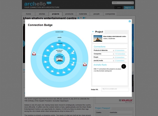 De ‘Connection Badge’ op Archello brengt in kaart welke connecties zijn gelegd tussen bedrijven, personen, materialen, producten, media en andere netwerksites. Hoe meer connecties een project heeft, hoe hoger het project op Archello scoort. Netwerken wordt zo aangemoedigd. Commercieel directeur Martijn Postmus zegt: “De ‘Connection Badge’ is de verzamelplaats van een project. Het stimuleert de groei van een project. Hoe meer verbindingen er gelegd worden, hoe rijker zichtbaarder het project wordt.”