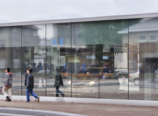 Bij de twee entrees tot de ondergrondse parkeergarage is een transparante gevel toegepast die vanuit de garage zicht biedt op het plein en omgekeerd. De volledig glazen gevel heeft een subtiel spiegelend effect waardoor het dak lijkt te zweven, verklaart het architectenbureau. Overdag is het gebouw hierdoor één met haar omgeving, ’s avonds is het gebouw volledig transparant en goed verlicht waardoor de auto’s ook dan op een sociaal veilige manier ondergronds kunnen worden geparkeerd.