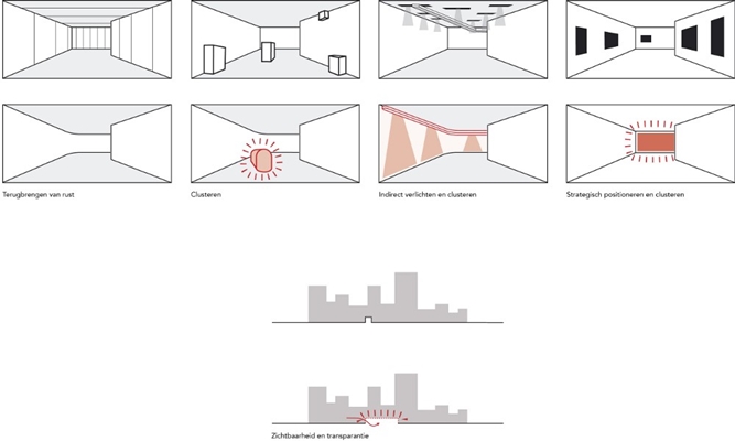 “Door indirecte verlichting van deze achtergrond wordt de ruimte op een comfortabele manier voelbaar. Lichtaccenten en vides op de juiste plaatsen zorgen voor de oriëntatie van de reiziger. Tenslotte worden alle ‘verrommelende’ elementen samengebracht en geïntegreerd in clusters. Deze clusters zorgen voor helderheid en kleur. Zij zijn aanpasbaar voor veranderingen in de toekomst. Door deze ingrepen wordt de metro weer helder en fris, en een comfortabele aanvulling op de openbare ruimte van Amsterdam.”