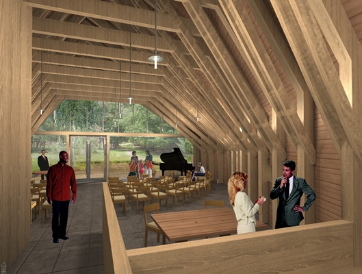 , bestaat uit één grote kenmerkende ruimte waarin stevige vurenhouten spanten de sfeer bepalen, zegt FARO. De binnenafwerking wordt opgebouwd uit gebruikte houten vloerdelen. De buitenzijde, zowel dak als wand, wordt bekleed met shingels van Frans acacia, die duurzaam is geteeld in snoeibossen.